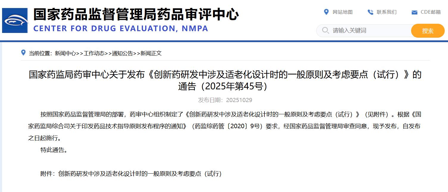 國家藥監(jiān)局藥審中心關(guān)于發(fā)布《創(chuàng)新藥研發(fā)中涉及適老化設(shè)計(jì)時(shí)的一般原則及考慮要點(diǎn)(試行)》的通告(2025年第45號)