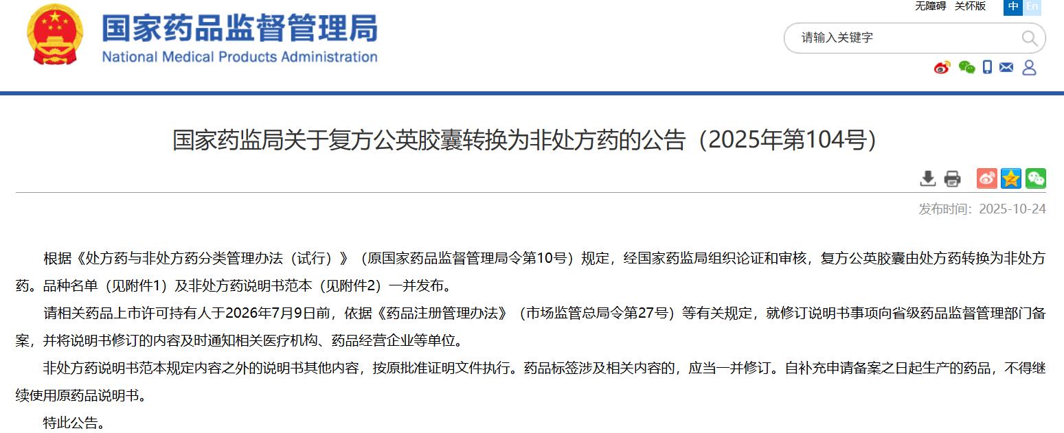 國家藥監(jiān)局關(guān)于復(fù)方公英膠囊轉(zhuǎn)換為非處方藥的公告(2025年第104號)
