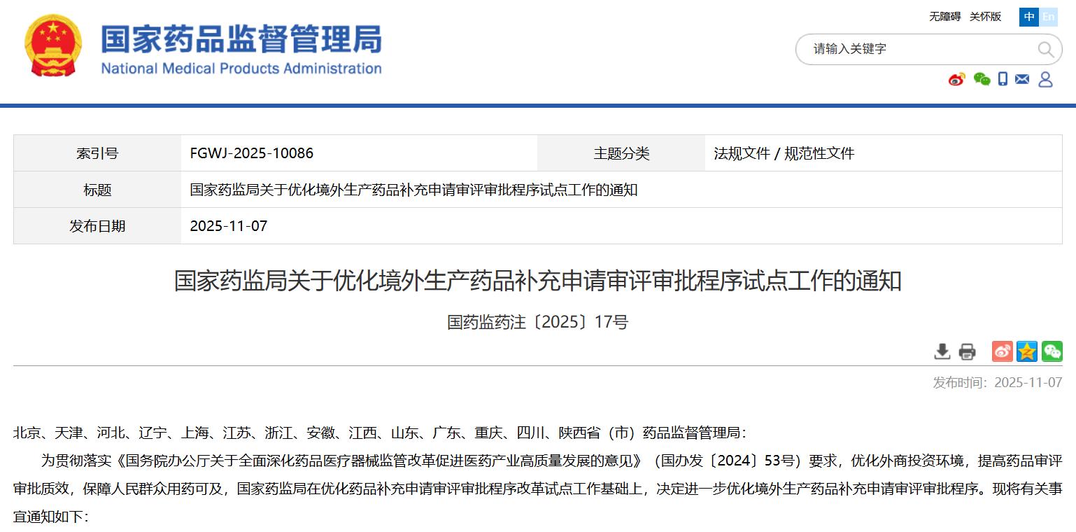 政策法規(guī) || 關(guān)于優(yōu)化境外生產(chǎn)藥品補(bǔ)充申請審評審批程序試點(diǎn)工作的通知(附法規(guī)概覽11.3-11.7)