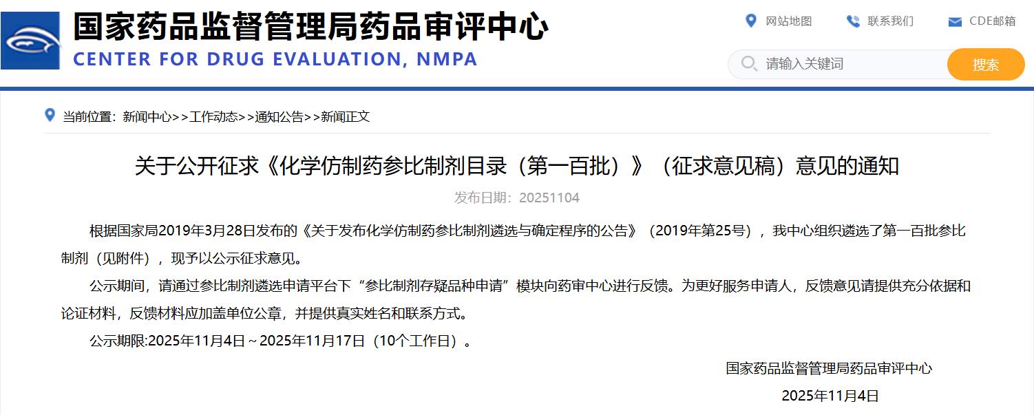 關(guān)于公開征求《化學(xué)仿制藥參比制劑目錄(第一百批)》(征求意見稿)意見的通知