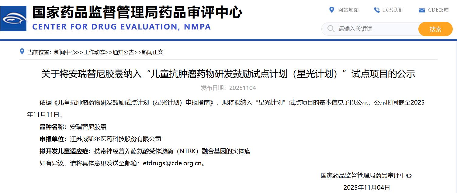 關(guān)于將安瑞替尼膠囊納入“兒童抗腫瘤藥物研發(fā)鼓勵試點(diǎn)計(jì)劃(星光計(jì)劃)”試點(diǎn)項(xiàng)目的公示