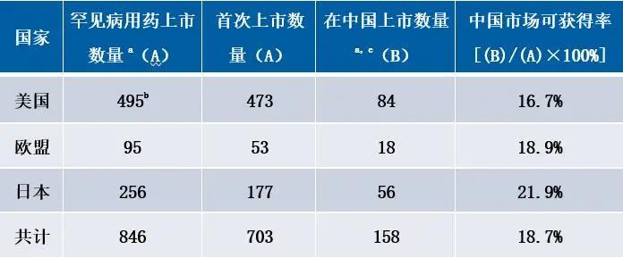 備注:a指罕見病用藥的種類;b包含撤回的罕見病用藥;c截止2018年9月30日。