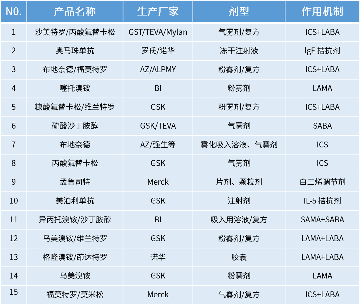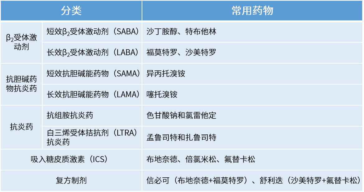 • 控制類藥物,即需要每天使用并長時間維持應(yīng)用的藥物,包括吸入性糖皮質(zhì)激素(ICS)、ICS/長效β2受體激動劑(ICS/LABA)、全身性激素、白三烯調(diào)節(jié)劑(LTRA)、緩釋茶堿、抗IgE單克隆抗體等;