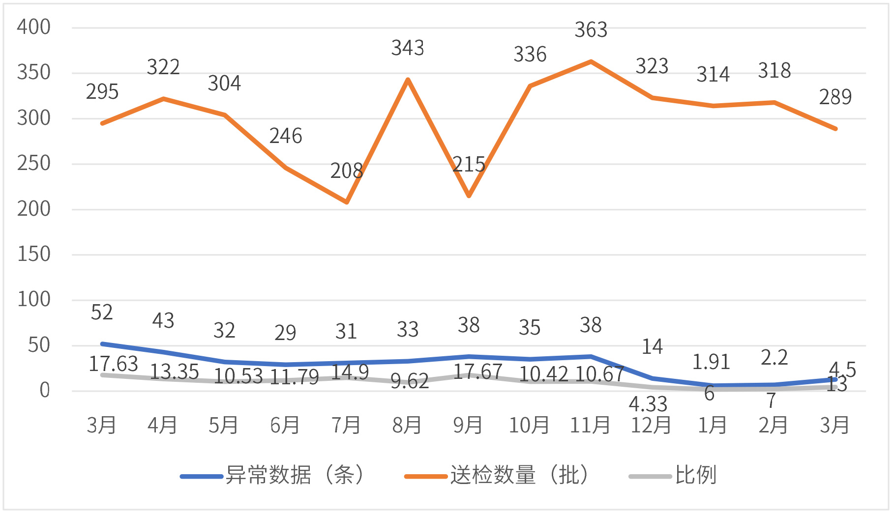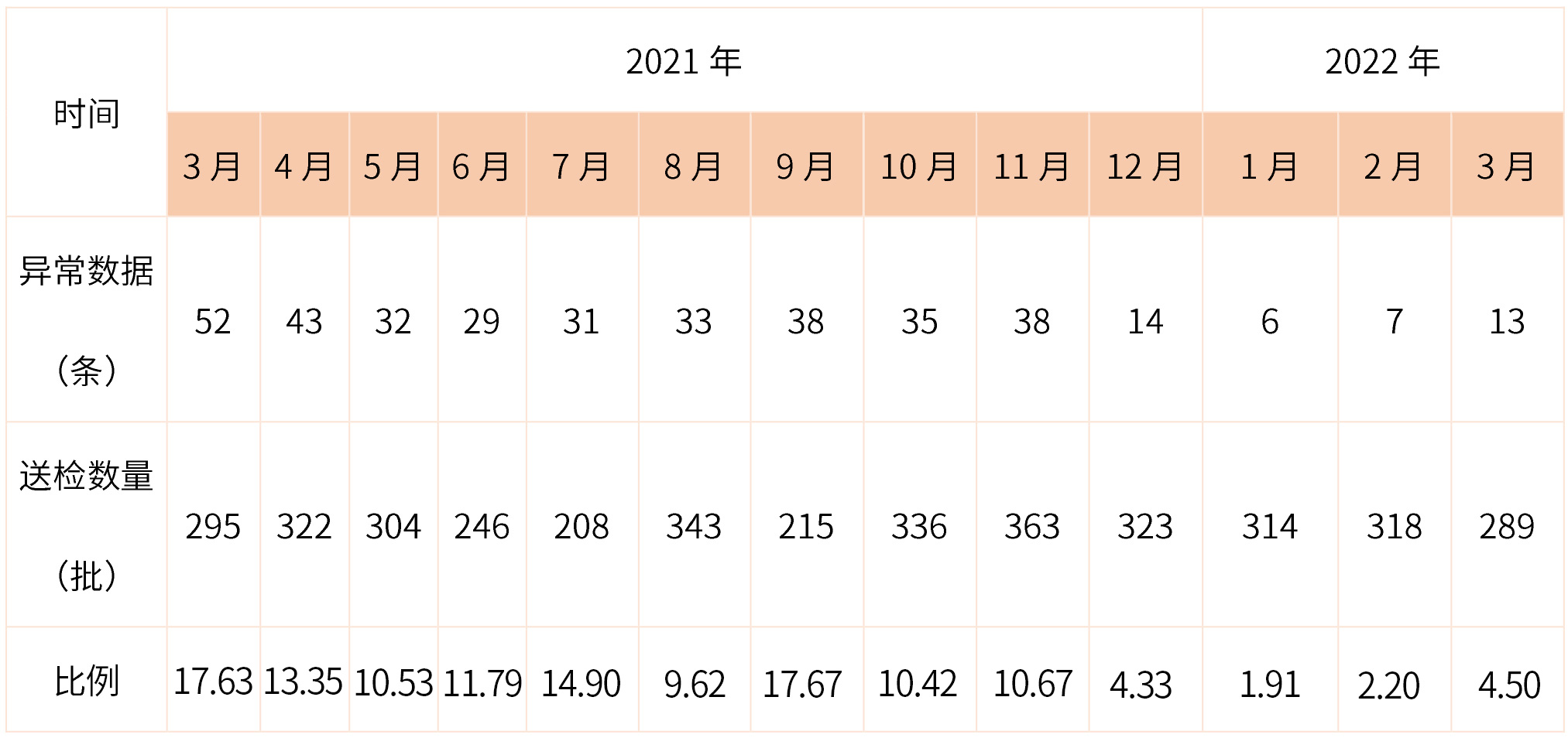 通過(guò)該工作方式,實(shí)驗(yàn)過(guò)程中數(shù)據(jù)的完整性、現(xiàn)場(chǎng)的合規(guī)性得到了很大的提高?,F(xiàn)以該公司2021年3月~2022年3月的異常數(shù)據(jù)指標(biāo)為例進(jìn)行效果分析。