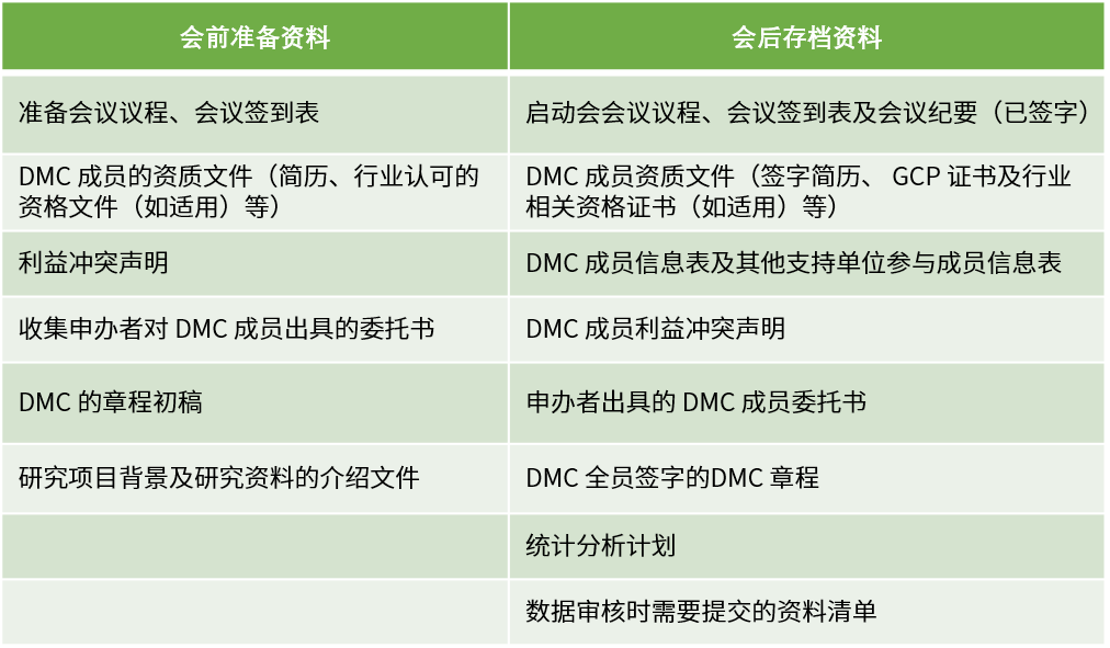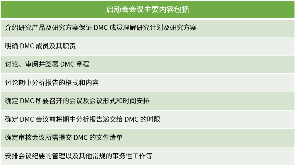 DMC啟動(dòng)會(huì)應(yīng)在首例受試者入組前召開,參會(huì)人員包含但不限于所有DMC成員、項(xiàng)目研究團(tuán)隊(duì)和獨(dú)立統(tǒng)計(jì)團(tuán)隊(duì)。