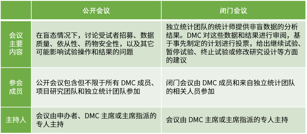 計(jì)劃會(huì)議需要按照根據(jù)DMC章程規(guī)定的頻率、形式開展,通常根據(jù) DMC目的以及試驗(yàn)預(yù)期入組率、事件發(fā)生率、隨訪期等執(zhí)行情況而定。DMC會(huì)議分為公開會(huì)議和閉門會(huì)議兩種形式。