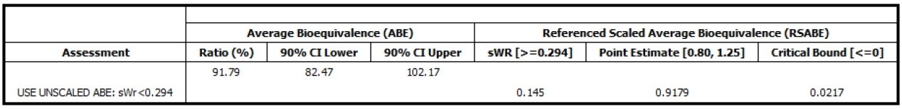 結(jié)論:本試驗為3周期設(shè)計,但因未能滿足sWR≥0.294,故無法采用RSABE算法,只能按照ABE算法計算90%置信區(qū)間,但計算結(jié)果表明Cmax的90%置信區(qū)間下限偏低(74.72%<80.00%),故本次試驗失敗,需重新擬定項目后續(xù)方案。