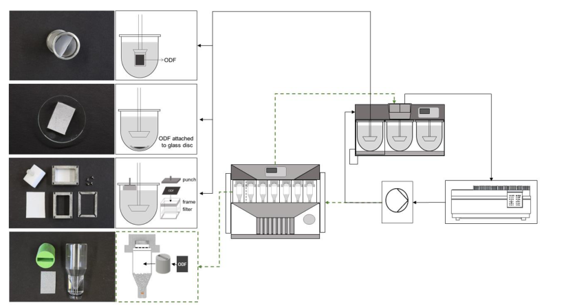 Raphael Kramp等人采用紫外光纖探頭實(shí)時(shí)檢測(cè)溶出數(shù)據(jù),基于槳法溶出方法設(shè)計(jì)開發(fā)了“Punch & Filter method”,主要設(shè)計(jì)增加了一個(gè)放置口溶膜的裝置,由不銹鋼框架,濾膜,14g壓沖組成,濾膜卡入不銹鋼框架中,口溶膜放置在濾膜上,14g壓沖放置在口溶膜上,溶出介質(zhì)從底部通過濾膜潤(rùn)濕口溶膜,使口溶膜在不銹鋼框架內(nèi)溶解,14g壓沖模擬舌機(jī)械力。