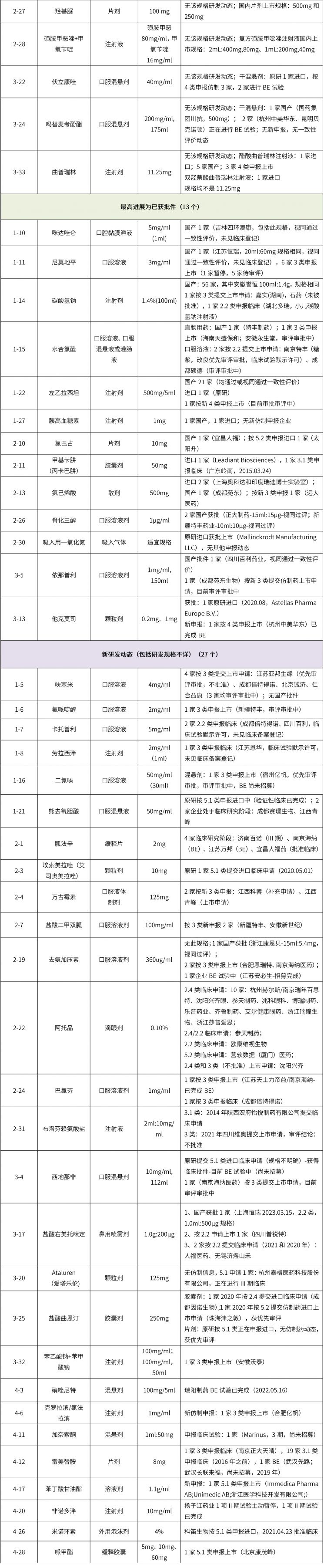 將鼓勵(lì)兒童用藥清單中化藥的國(guó)內(nèi)研發(fā)情況進(jìn)行梳理,其中40個(gè)化藥已有公開(kāi)研發(fā)動(dòng)態(tài)(35.09%),13個(gè)品種已獲批件(11.40%)、27個(gè)品種處于臨床或申報(bào)階段。企業(yè)研發(fā)熱度較高的品種有碳酸氫鈉注射液、左乙拉西坦注射液、阿托品滴眼液、呋塞米口服溶液、胍法辛緩釋片等。清單中65%以上的化藥(約74個(gè)品規(guī))暫無(wú)企業(yè)申報(bào)或者公開(kāi)研發(fā)動(dòng)態(tài),對(duì)于擬布局兒童藥物市場(chǎng)的企業(yè),還有很多的選擇空間。
