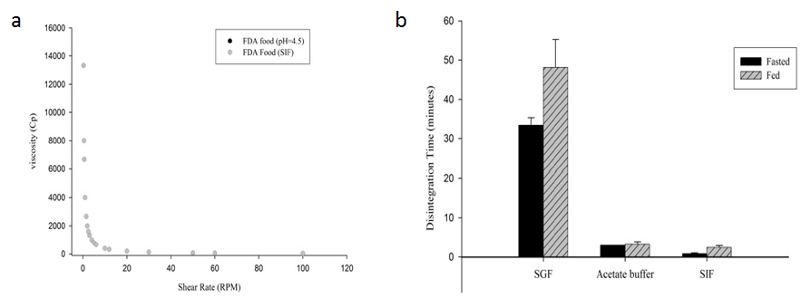 圖1 a:標(biāo)準(zhǔn)高脂餐(醋酸鹽和磷酸鹽緩沖液)在不同剪切速率下的粘度;b:克拉霉素在不同介質(zhì)中的平均崩解時間
