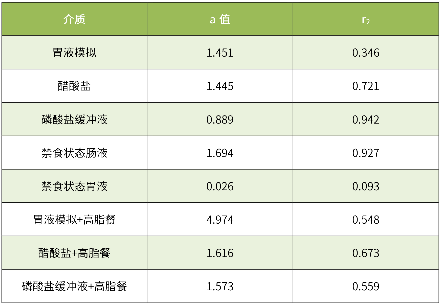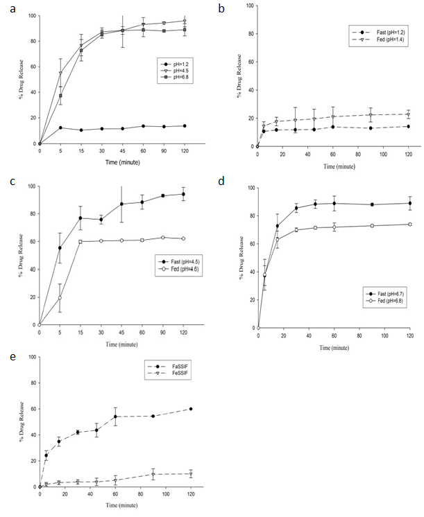 • 研究表明食物對藥物的釋放和片劑的崩解具有顯著影響,由于pH和膽酸鹽濃度變化,含有標(biāo)準(zhǔn)高脂餐的介質(zhì)和生理相關(guān)介質(zhì)中的溶出差異顯著。