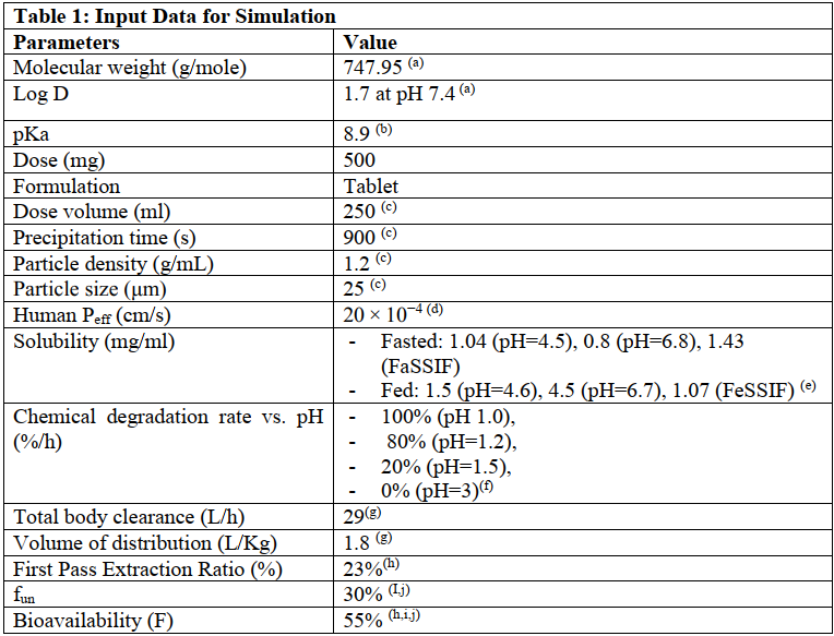 ? 敏感性分析:選擇參數(shù)溶解性、滲透性、胃排空速率、胃腸pH、胃排空時間、總清除率、肝腸首過效應(yīng)(FPE)對空腹及餐后試驗條件下克拉霉素的吸收進(jìn)行敏感性分析。根據(jù)結(jié)果,清除率、肝臟首過效應(yīng)和腸道首過效應(yīng)對克拉霉素的Cmax及AUC具有顯著影響。然而,溶解性、滲透性、胃腸pH對克拉霉素的吸收無影響。餐后試驗條件下,Cmax受胃排空速率影響,Cmax隨胃滯留時間延長而降低。經(jīng)敏感性分析發(fā)現(xiàn),廣泛的肝臟代謝和腸道首過效應(yīng)可能會導(dǎo)致PK參數(shù)大幅度的下降,給藥后肝血流量增加也會降低肝提取率并增大藥物生物利用度。