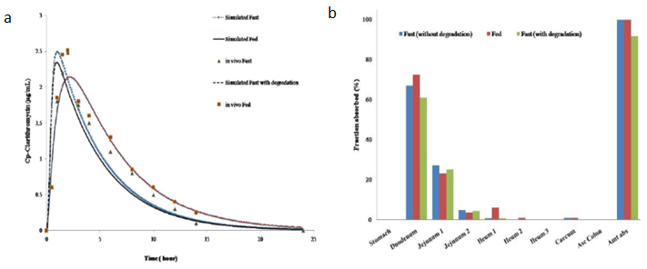 研究藥物的酸降解對克拉霉素口服生物利用度的影響發(fā)現(xiàn),考慮酸降解時Cmax和AUC減小??死顾卦谖改c道吸收快速,且模型預(yù)測空腹條件下克拉霉素吸收分?jǐn)?shù)為91.6%,餐后條件下吸收100%。考慮原因為克拉霉素在胃pH環(huán)境中不穩(wěn)定,降低了藥物的吸收。空腹?fàn)顟B(tài)下克拉霉素67.1%吸收分布在十二指腸,27.1%的劑量在空腸。餐后狀態(tài)下,克拉霉素吸收完全,由于膽汁再攝取增強(qiáng),73.7%劑量比例吸收分布在十二指腸,22.1%分布在空腸。