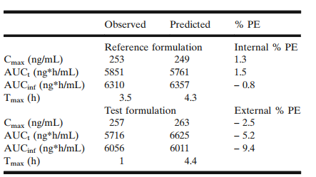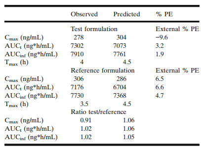 采用參比制劑的PK和體外數(shù)據(jù),建立模型,并采用該模型,進行內(nèi)部驗證,PE小于10%,符合FDA的指導原則。根據(jù)該原則,可以建立IVIVC。采用IVIVC模型,模擬每個處方,要求模擬的結果和實測值的PE不超過15%,該模型可以用于模擬仿制藥的血藥濃度。