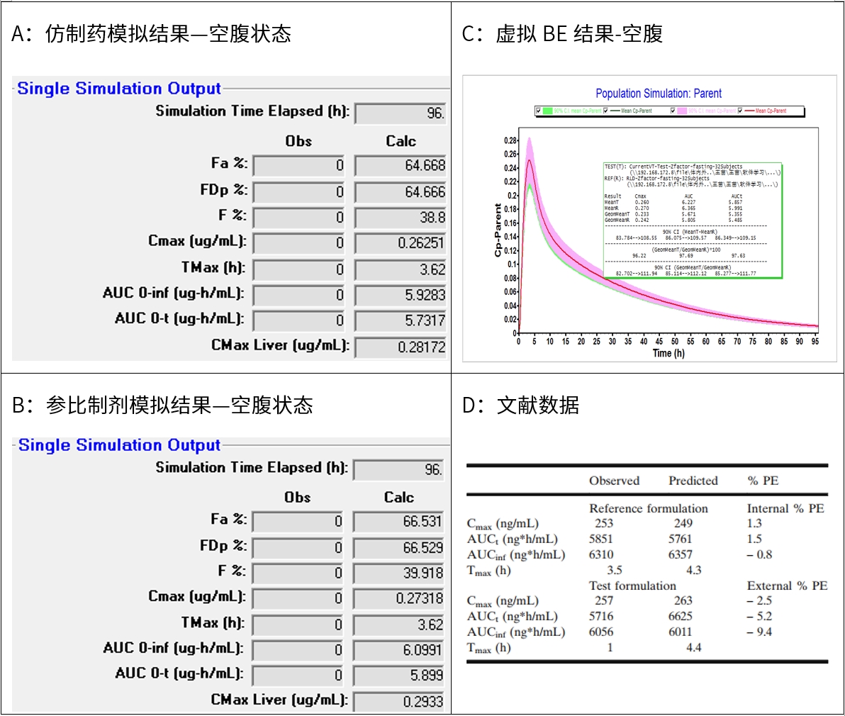 無論空腹和餐后狀態(tài),仿制藥和參比制劑虛擬BE試驗均生物等效,表明原料藥晶型變更后,雖然原料藥特性有所變化,但均能實現(xiàn)與仿制藥生物等效。該模擬結果與文獻報道一致。