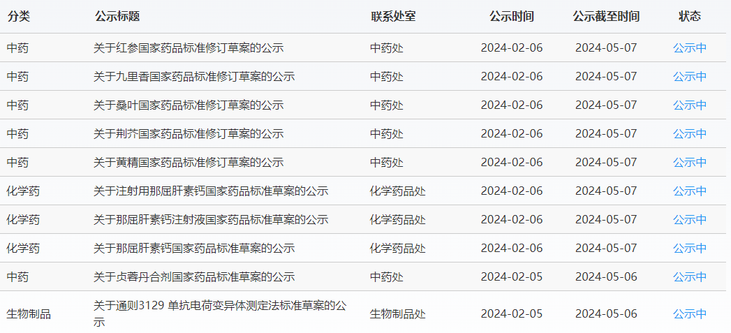 本周國(guó)家藥典委共發(fā)布5個(gè)國(guó)家藥品標(biāo)準(zhǔn)草案的公示,5個(gè)國(guó)家藥品標(biāo)準(zhǔn)修訂草案的公示。