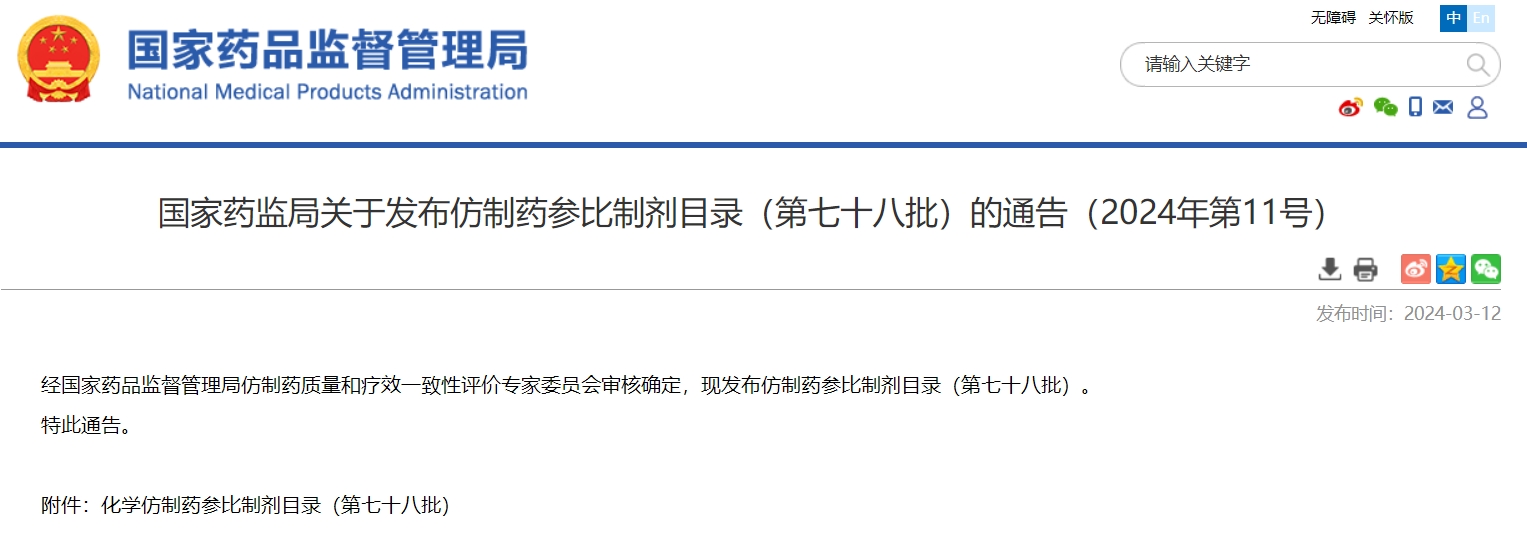 國家藥監(jiān)局關(guān)于發(fā)布仿制藥參比制劑目錄(第七十八批)的通告(2024年第11號(hào))