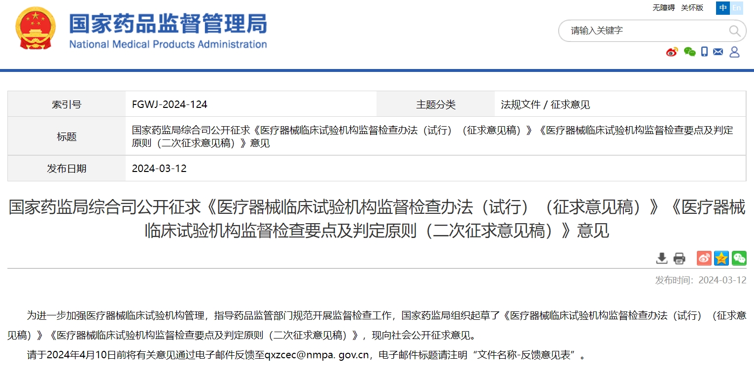 國家藥監(jiān)局綜合司公開征求《醫(yī)療器械臨床試驗(yàn)機(jī)構(gòu)監(jiān)督檢查辦法(試行)(征求意見稿)》《醫(yī)療器械臨床試驗(yàn)機(jī)構(gòu)監(jiān)督檢查要點(diǎn)及判定原則(二次征求意見稿)》意見