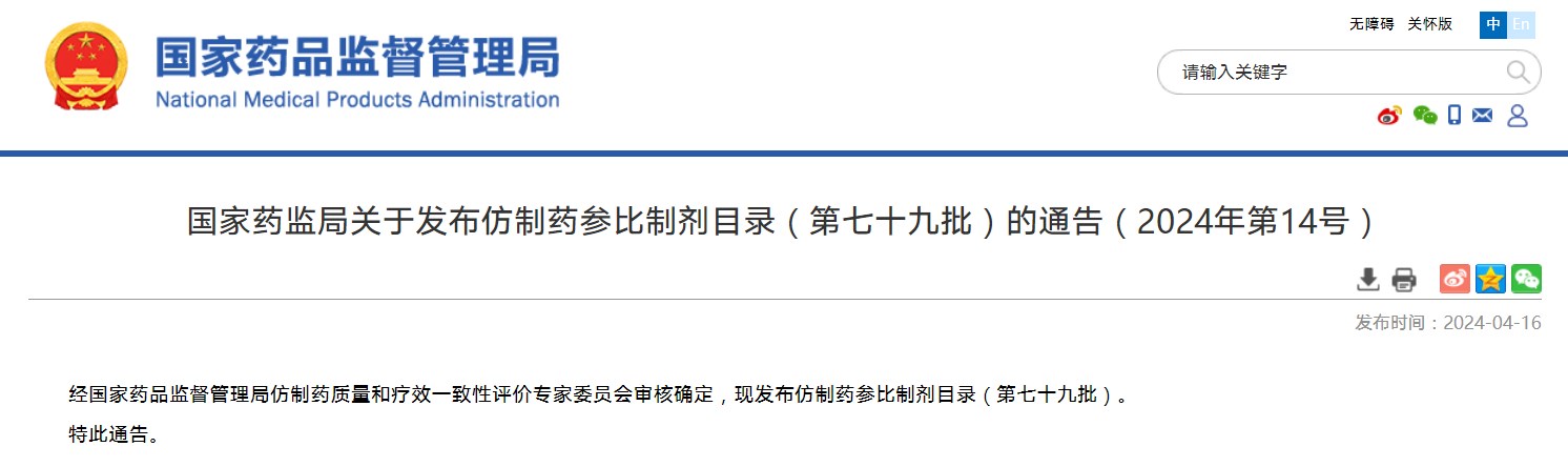 國家藥監(jiān)局關(guān)于發(fā)布仿制藥參比制劑目錄(第七十九批)的通告(2024年第14號)