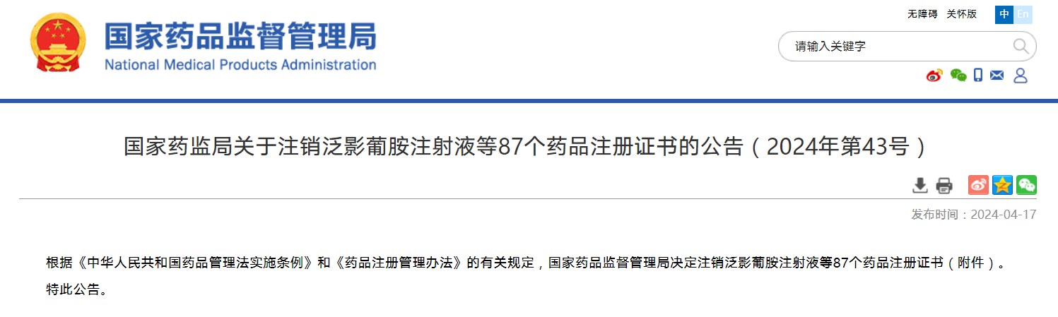 國家藥監(jiān)局關(guān)于注銷泛影葡胺注射液等87個藥品注冊證書的公告(2024年第43號)