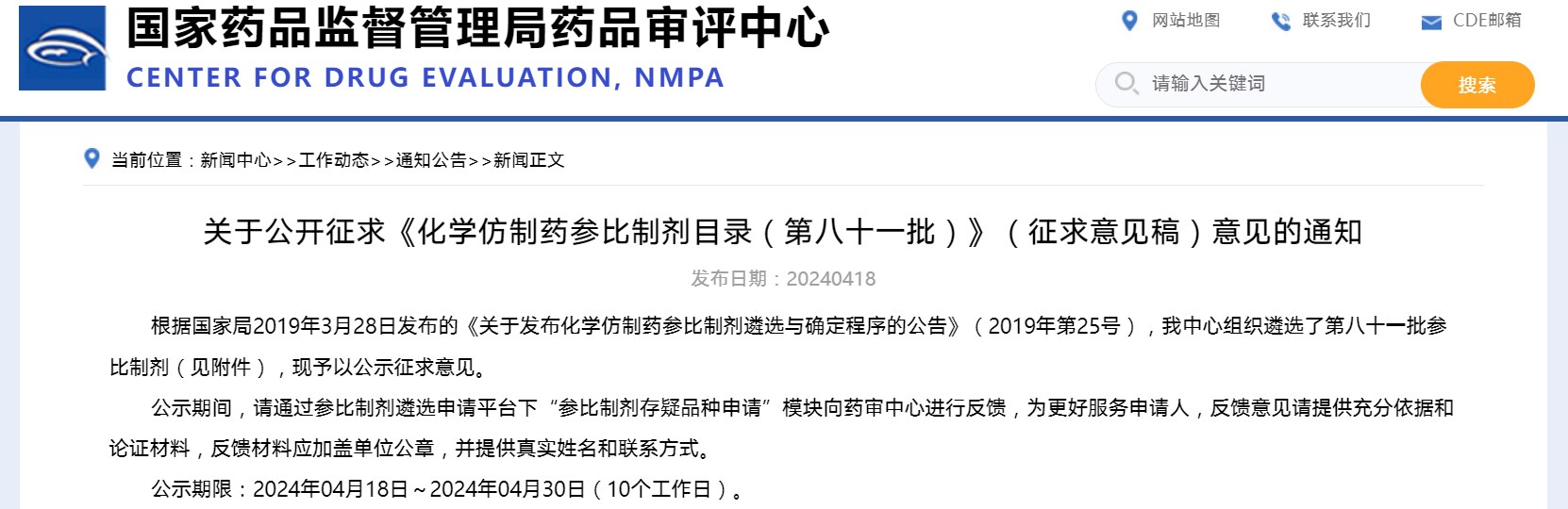 關(guān)于公開征求《化學仿制藥參比制劑目錄(第八十一批)》(征求意見稿)意見的通知