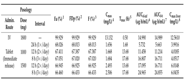 · 針對于口服給藥的模型,劑型選擇速釋片劑,不同的給藥方案如下:每日一次、兩次、三次給予1000mg的片劑,以及每日三次給予1500mg的片劑,上述口服給藥所選擇的劑量均近似當(dāng)前標(biāo)準(zhǔn)的治療劑量。