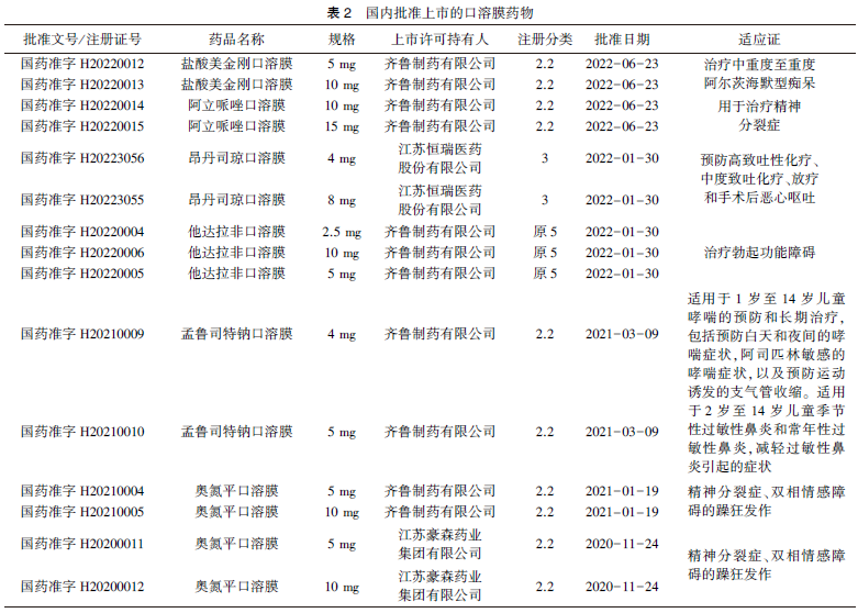 通過國家藥品監(jiān)督管理局網(wǎng)站查詢,統(tǒng)計了我國批準的口溶膜藥物(見表2),共15個批準文號,按照注冊分類統(tǒng)計,其中10個為2.2類改良型新藥,占大多數(shù);按適應證統(tǒng)計,其中6個為精神障礙疾病藥物、3個為生殖系統(tǒng)疾病藥物、2個為精神神經(jīng)系統(tǒng)藥物、2個為呼吸系統(tǒng)疾病及抗過敏藥物、2個消化道及代謝藥物。