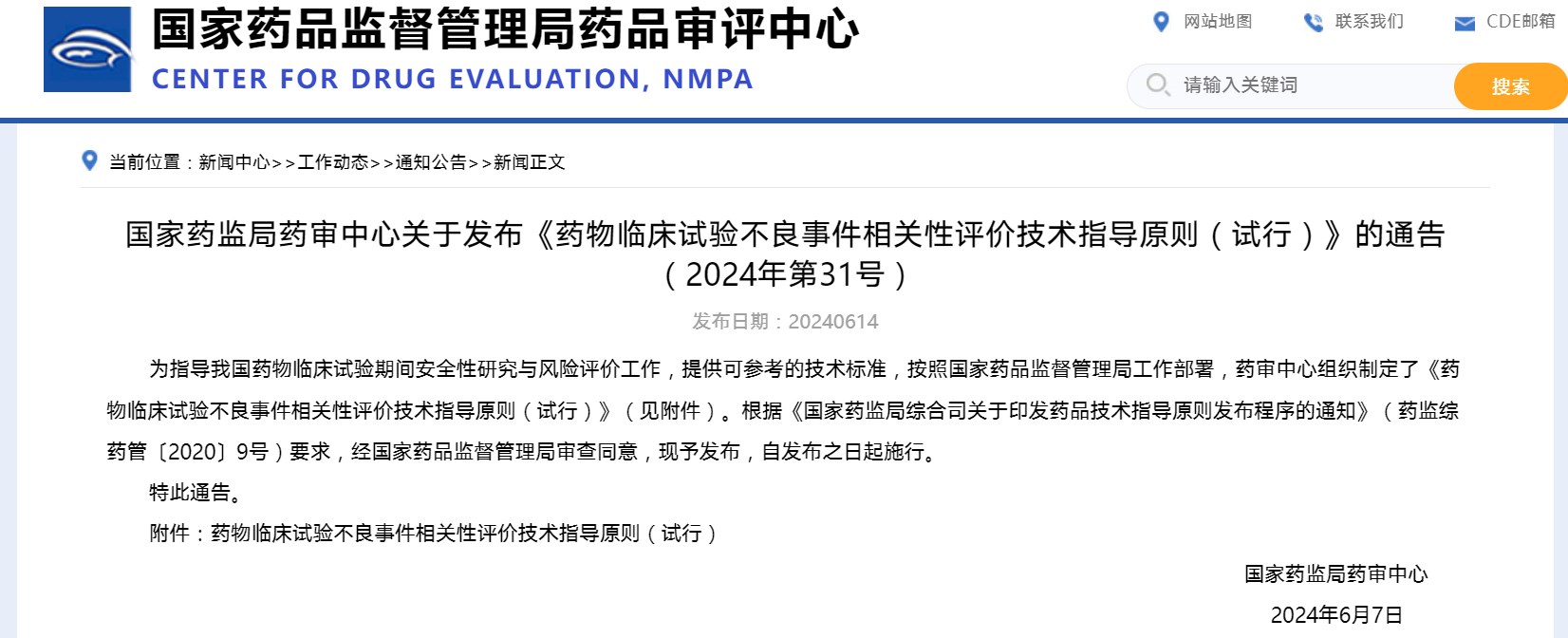 國(guó)家藥監(jiān)局藥審中心關(guān)于發(fā)布《藥物臨床試驗(yàn)不良事件相關(guān)性評(píng)價(jià)技術(shù)指導(dǎo)原則(試行)》的通告(2024年第31號(hào))