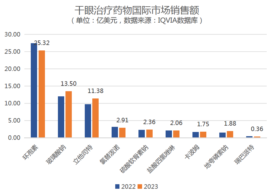 2023年,國際市場干眼癥的銷售額最高的產(chǎn)品變化不大,主要有環(huán)孢素(25.32億)、玻璃酸鈉(13.50億)、立他司特(11.38億)和氯替潑諾(2.91億)。從增長情況來看,增長率最快的產(chǎn)品分別為立他司特(+16.7%)、玻璃酸鈉(13.0%)和地夸磷索鈉(+29.7%)。