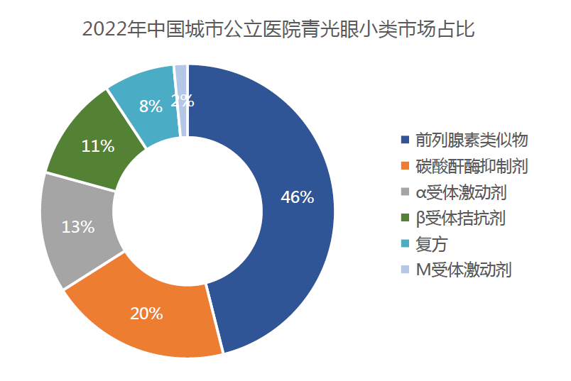 抗青光眼藥物可分為5類,作為一線治療藥物的前列腺素類似物在2022年以46%的比例主導(dǎo)市場,碳酸酐酶抑制劑、β腎上腺素拮抗劑、α腎上腺素能受體激動劑、復(fù)方制劑分別占20%、13%、11%和8%的市場份額。