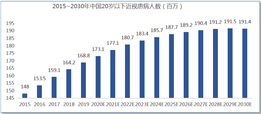 圖8:2015-2030年中國20歲以下近視患病人數(shù)