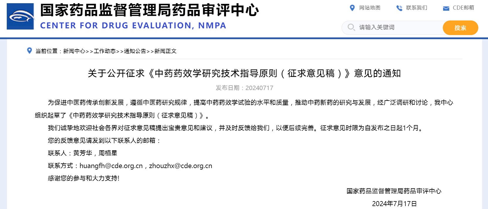 關(guān)于公開(kāi)征求《中藥藥效學(xué)研究技術(shù)指導(dǎo)原則(征求意見(jiàn)稿)》意見(jiàn)的通知