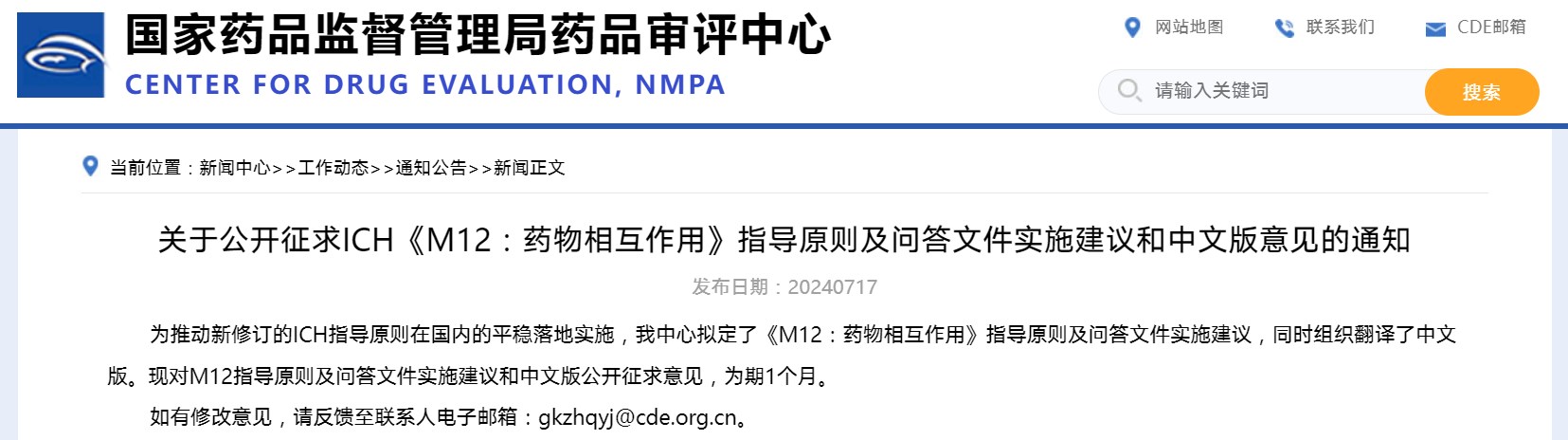 關(guān)于公開(kāi)征求ICH《M12:藥物相互作用》指導(dǎo)原則及問(wèn)答文件實(shí)施建議和中文版意見(jiàn)的通知