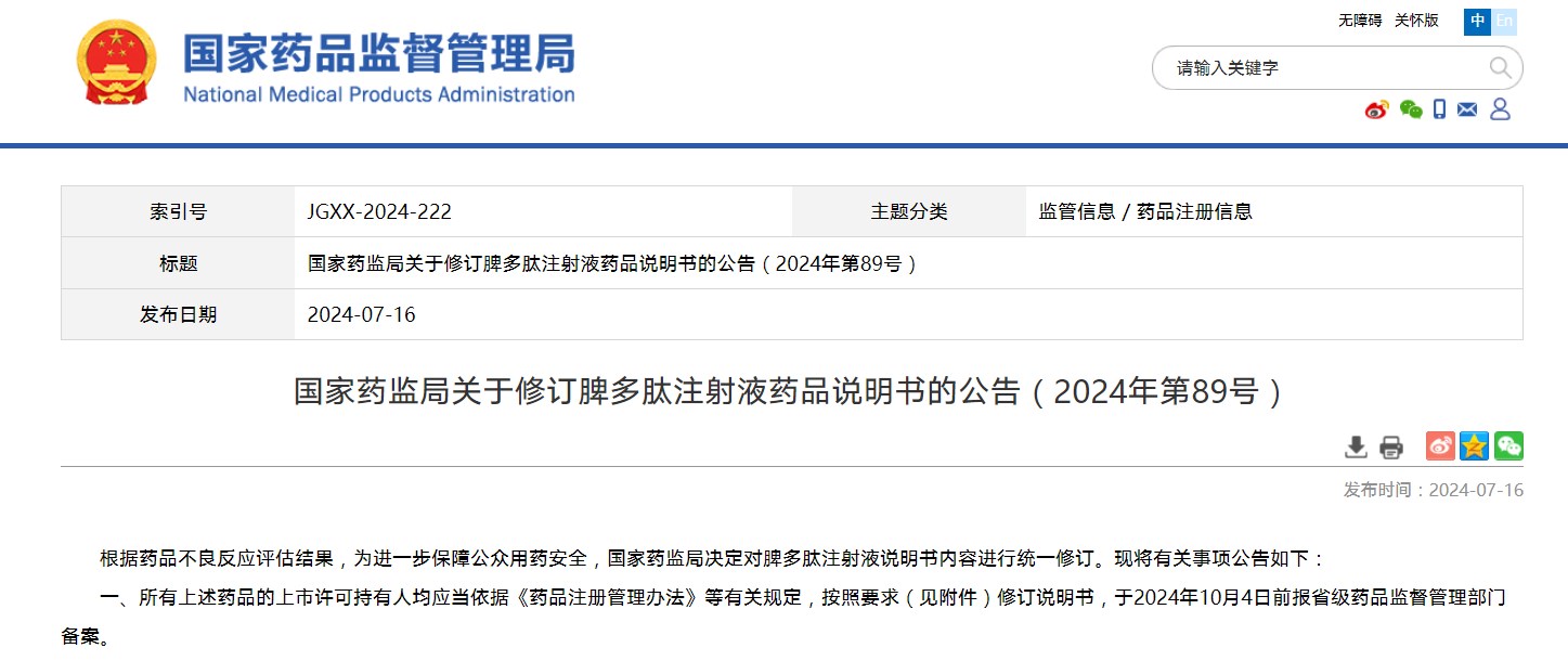 國(guó)家藥監(jiān)局關(guān)于修訂脾多肽注射液藥品說(shuō)明書(shū)的公告(2024年第89號(hào))