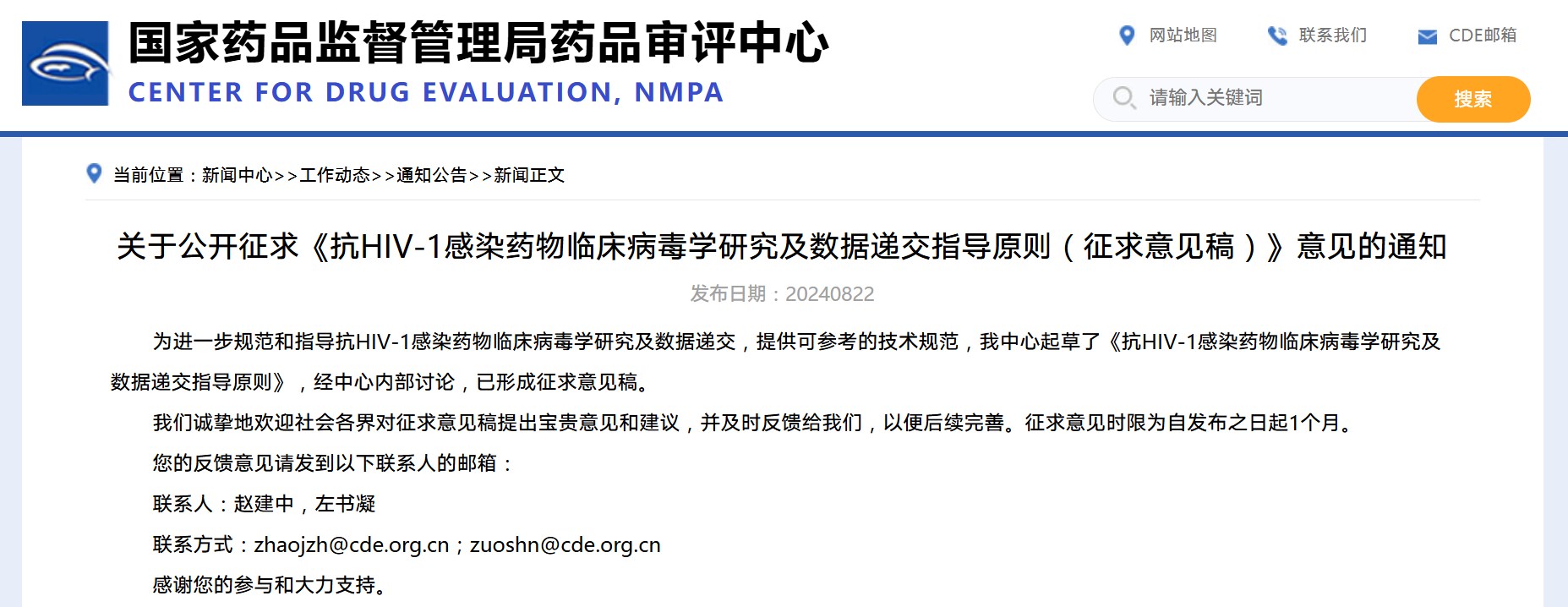 關(guān)于公開征求《抗HIV-1感染藥物臨床病毒學(xué)研究及數(shù)據(jù)遞交指導(dǎo)原則(征求意見稿)》意見的通知