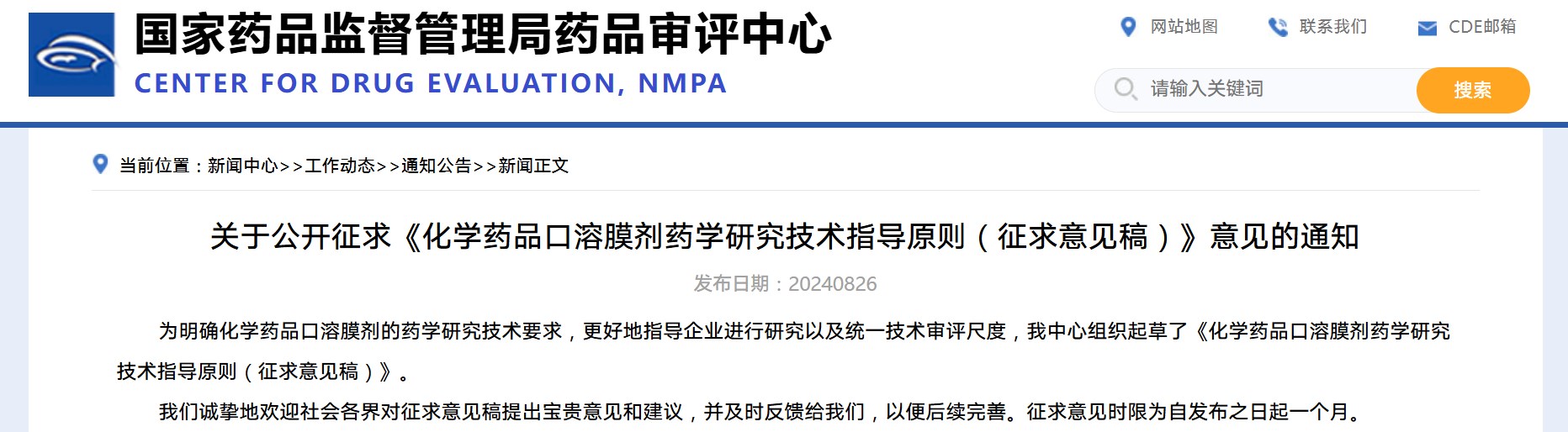 國家藥監(jiān)局藥審中心關(guān)于公開征求《化學(xué)藥品口溶膜劑藥學(xué)研究技術(shù)指導(dǎo)原則(征求意見稿)》意見的通知