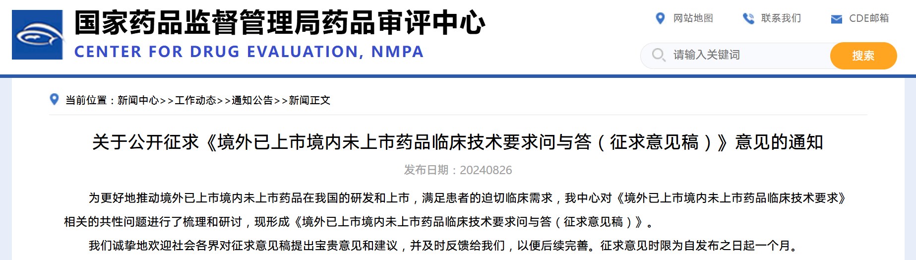 國家藥監(jiān)局藥審中心關(guān)于公開征求《境外已上市境內(nèi)未上市藥品臨床技術(shù)要求問與答(征求意見稿)》意見的通知