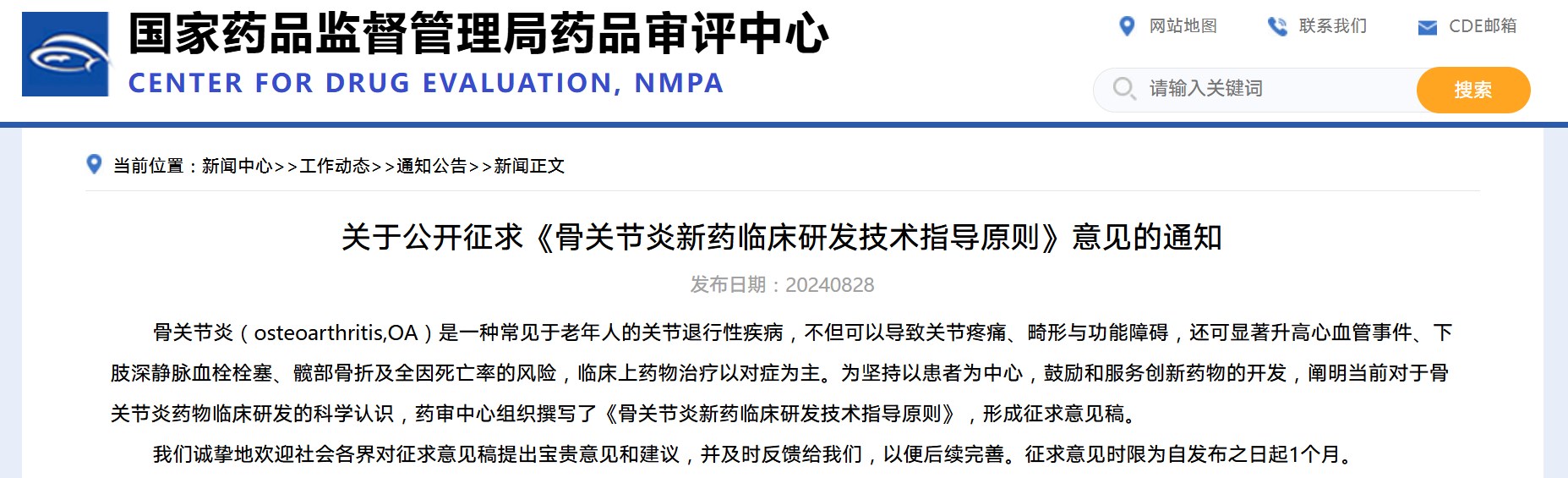 國家藥監(jiān)局藥審中心關(guān)于公開征求《骨關(guān)節(jié)炎新藥臨床研發(fā)技術(shù)指導(dǎo)原則》意見的通知
