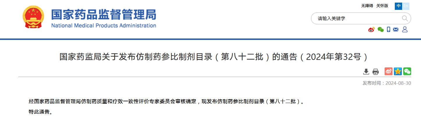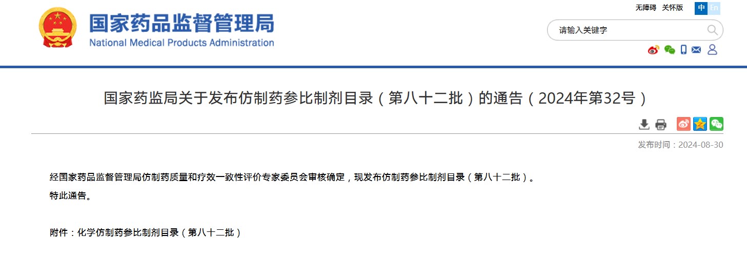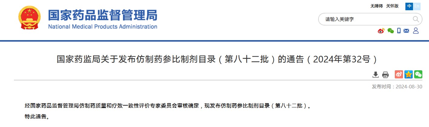 國家藥監(jiān)局關(guān)于發(fā)布仿制藥參比制劑目錄(第八十二批)的通告(2024年第32號)