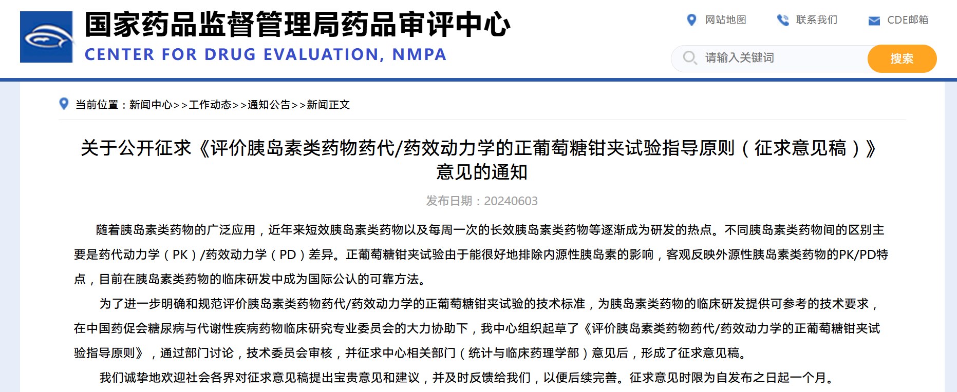 關(guān)于公開征求《評價胰島素類藥物藥代/藥效動力學(xué)的正葡萄糖鉗夾試驗指導(dǎo)原則(征求意見稿)》意見的通知