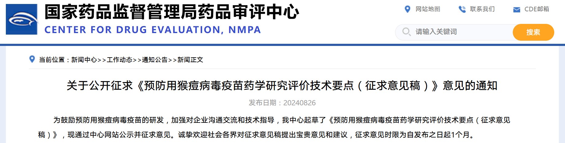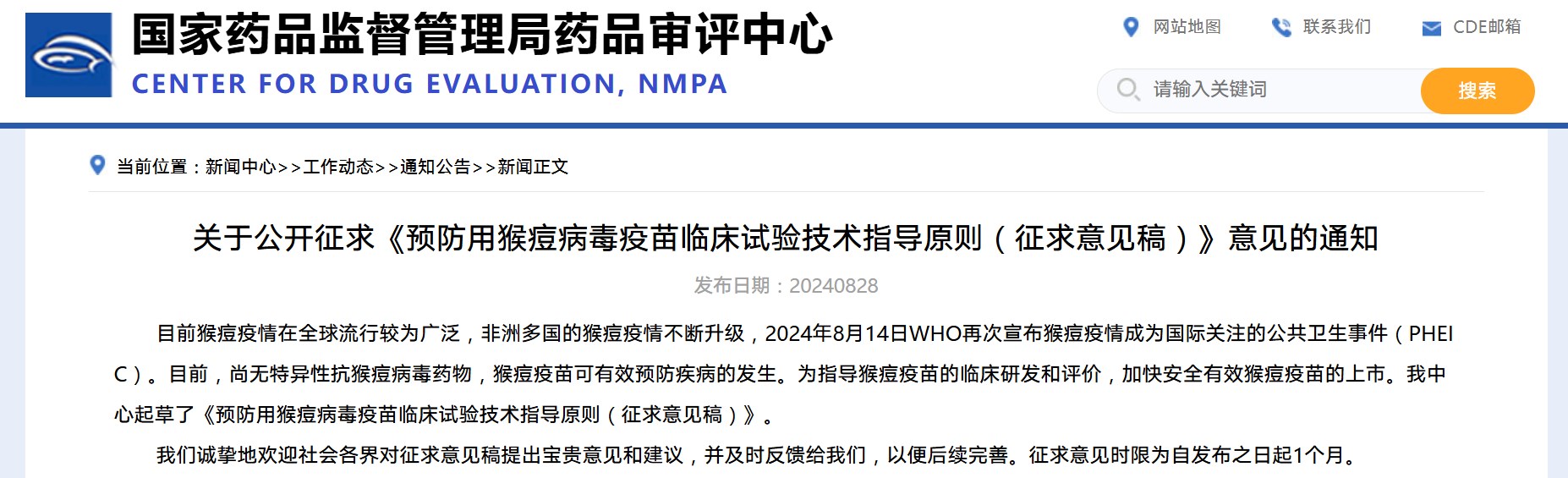 關(guān)于公開征求《預(yù)防用猴痘病毒疫苗藥學(xué)研究評價技術(shù)要點(征求意見稿)》意見的通知