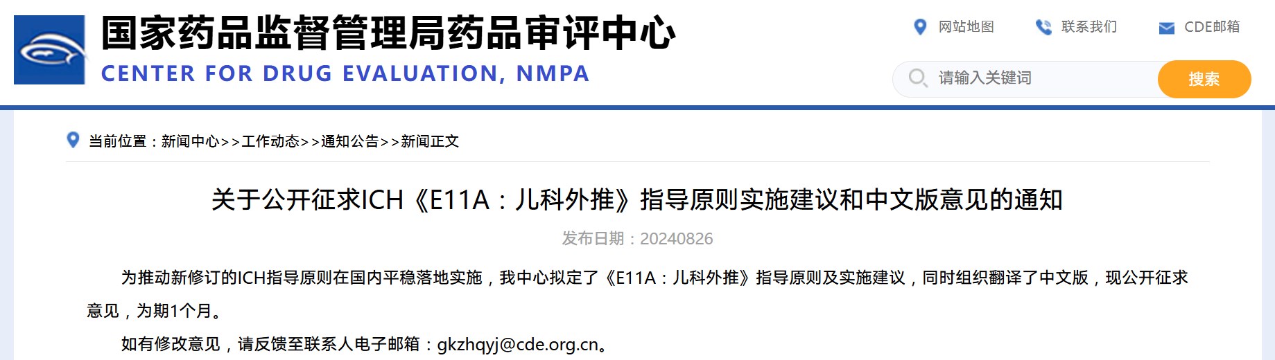 關(guān)于公開征求ICH《E11A:兒科外推》指導(dǎo)原則實施建議和中文版意見的通知