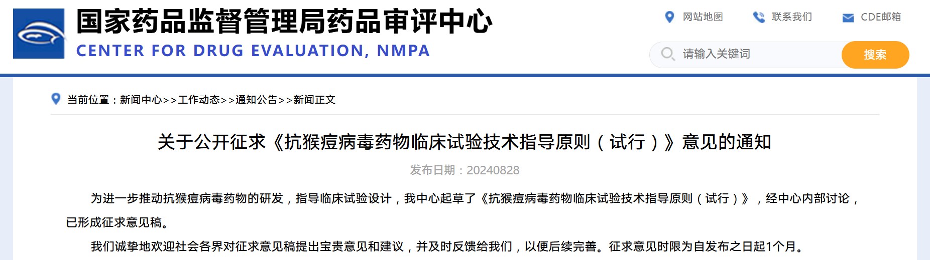 關(guān)于公開征求《抗猴痘病毒藥物臨床試驗技術(shù)指導(dǎo)原則(試行)》意見的通知