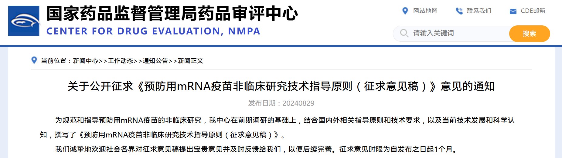 關(guān)于公開征求《預(yù)防用mRNA疫苗非臨床研究技術(shù)指導(dǎo)原則(征求意見稿)》意見的通知