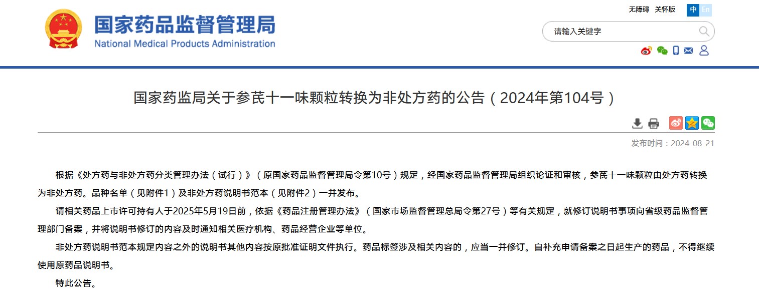 國家藥監(jiān)局關(guān)于參芪十一味顆粒轉(zhuǎn)換為非處方藥的公告(2024年第104號)