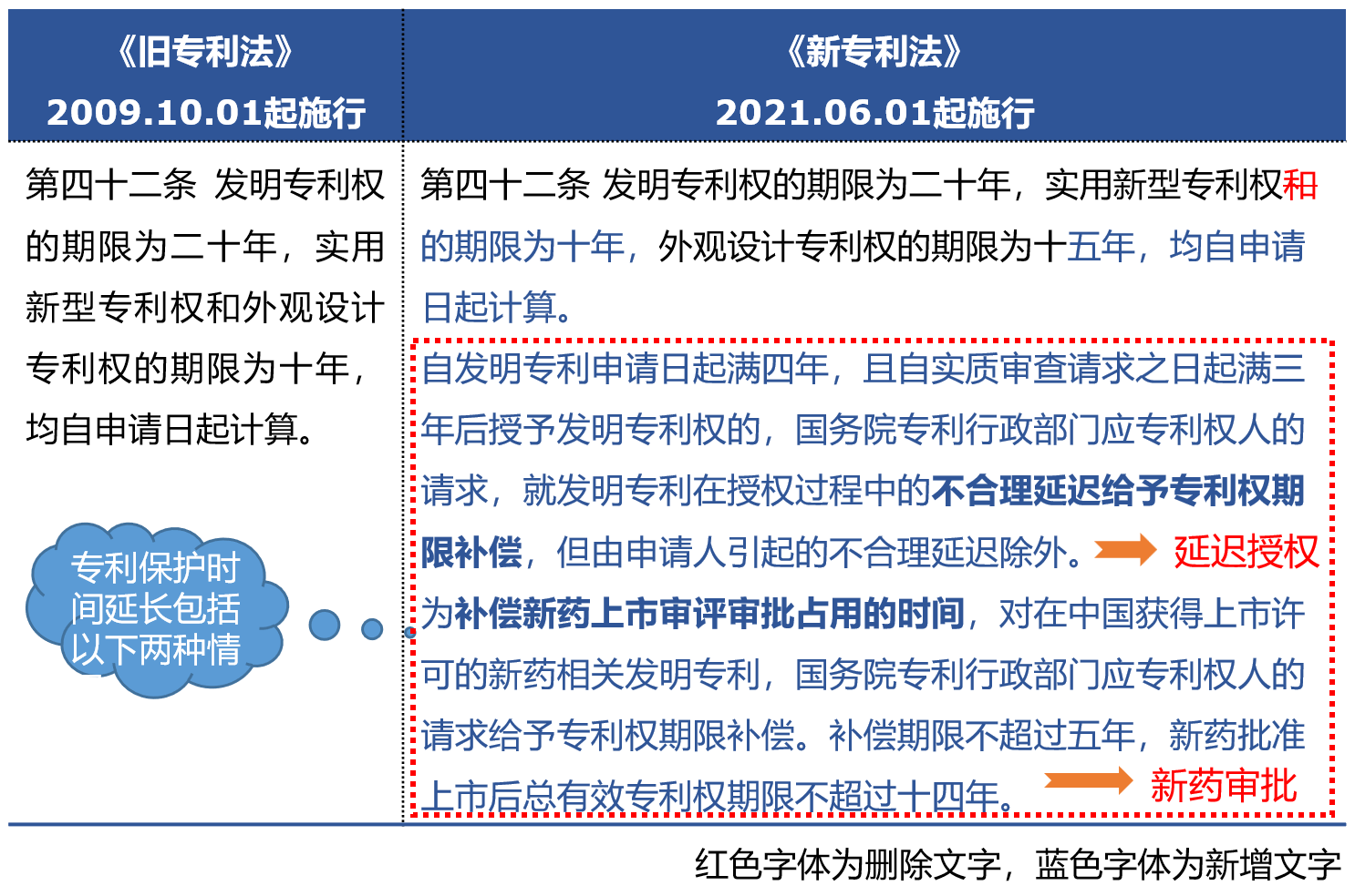 第三款中規(guī)定,為補償新藥上市審評審批占用的時間,對在中國獲得上市許可的新藥相關(guān)發(fā)明專利,國務(wù)院專利行政部門應(yīng)專利權(quán)人的請求給予專利權(quán)期限補償。補償期限不超過五年,新藥批準(zhǔn)上市后總有效專利權(quán)期限不超過十四年。