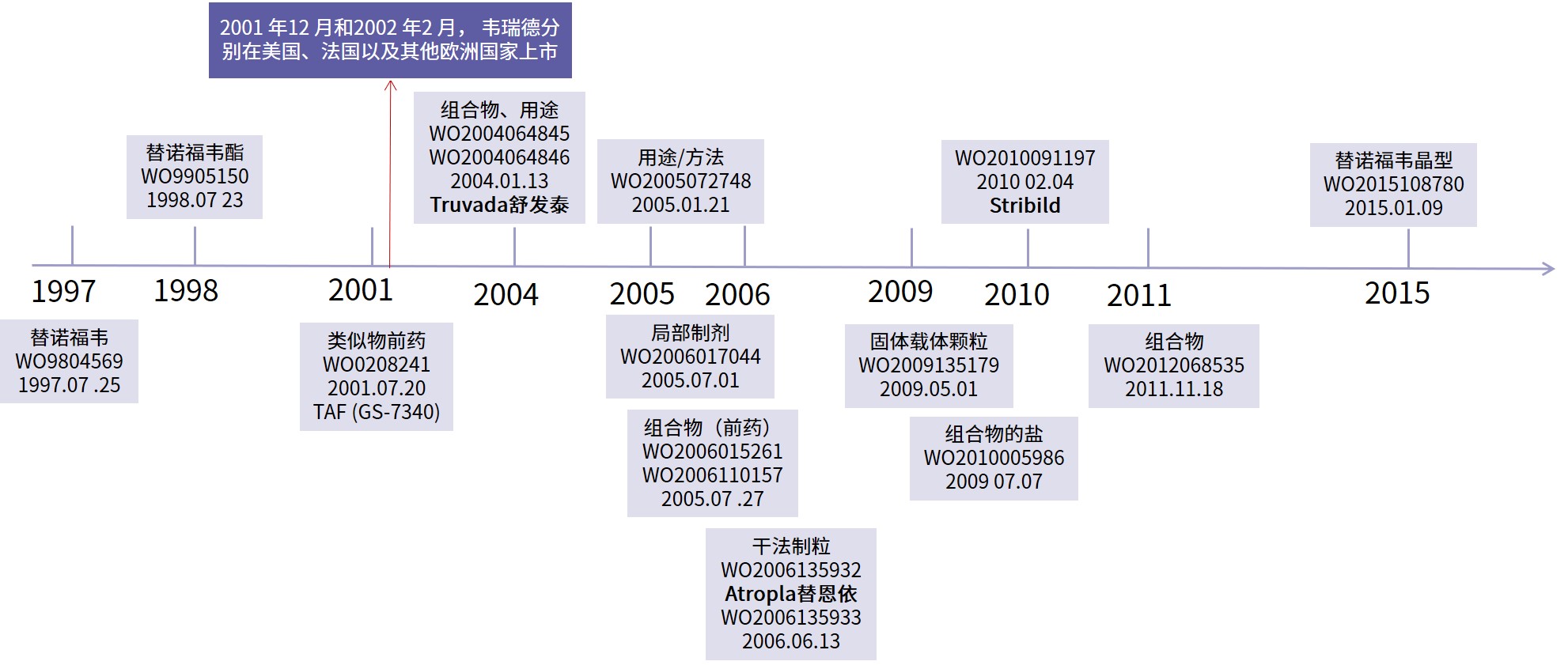 首先,以時(shí)間為導(dǎo)向,縱向分析原研公司對(duì)替諾福韋酯的專利的布局,見(jiàn)下圖。