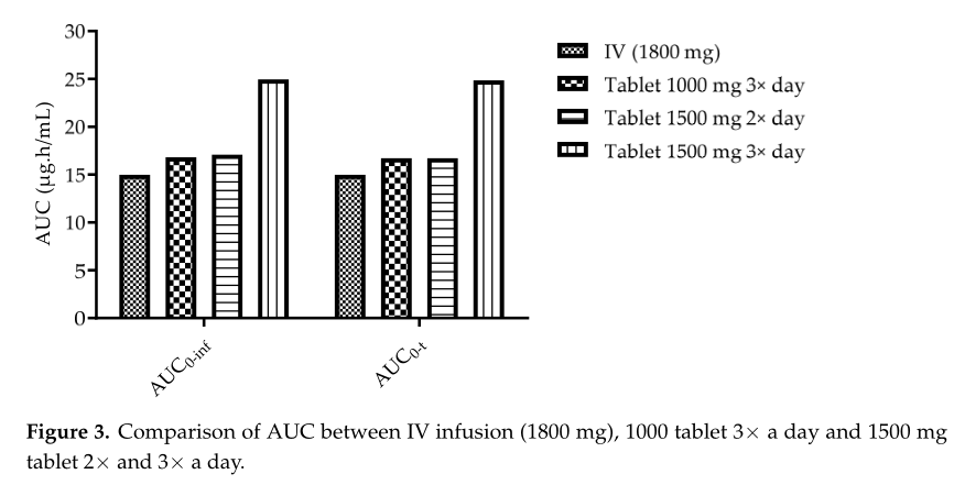 所有口服給藥的研究方案中所預(yù)測的Cmax均低于靜脈推注的結(jié)果(模擬最大的Cmax為2.496mg/L,為每日三次給藥1500mg片劑后預(yù)測值)。